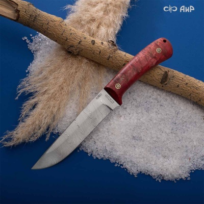 Рукоять выполнена из стабилизированной карельской берёзы — прочного и влагостойкого материала, сохраняющего природную красоту древесины. Эргономичная форма удобно ложится в руку, подходит для ладони любого размера и гарантирует уверенный хват. Гарда средней величины защищает пальцы при работе, а накладной неразборный монтаж обеспечивает долговечность конструкции.