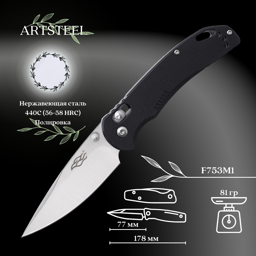 В открытом положении, размер модели Firebird F753M1 равен 17.8 см. Рукоятка этого ножа выполнена с использованием композитного материала G10. Он получен путем соединения стекловолокна с эпоксидными смолами. Этот материал совсем легкий, но по прочности практически не уступает стальной основе рукоятки. Мелкая текстурная накатка на стеклопластике помогает крепко держать нож в руках. Кроме того, нож можно дополнительно пристраховать при помощи темляка, который, при желании, вдевается в отверстие на ручке Firebird F753M1. Клипса же, используемая для ношения на ремне, изготовлена из стали.