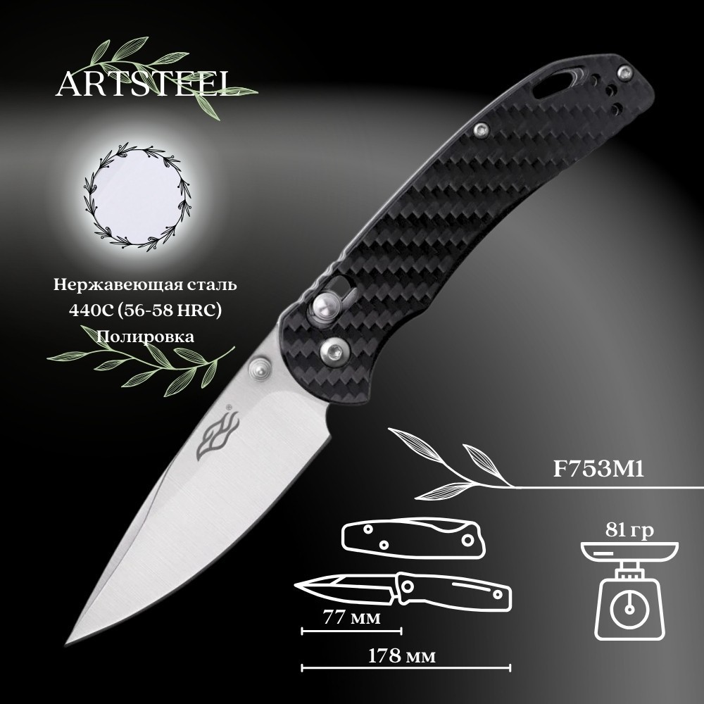 В открытом положении, размер модели Firebird F753M1-CF равен 17.8 см. Рукоятка этого ножа выполнена из карбона. Этот материал совсем легкий, но по прочности практически не уступает стальной основе рукоятки. Кроме того, нож можно дополнительно пристраховать при помощи темляка, который, при желании, вдевается в отверстие на ручке Firebird F753M1-CF. Клипса же, используемая для ношения на ремне, изготовлена из стали.