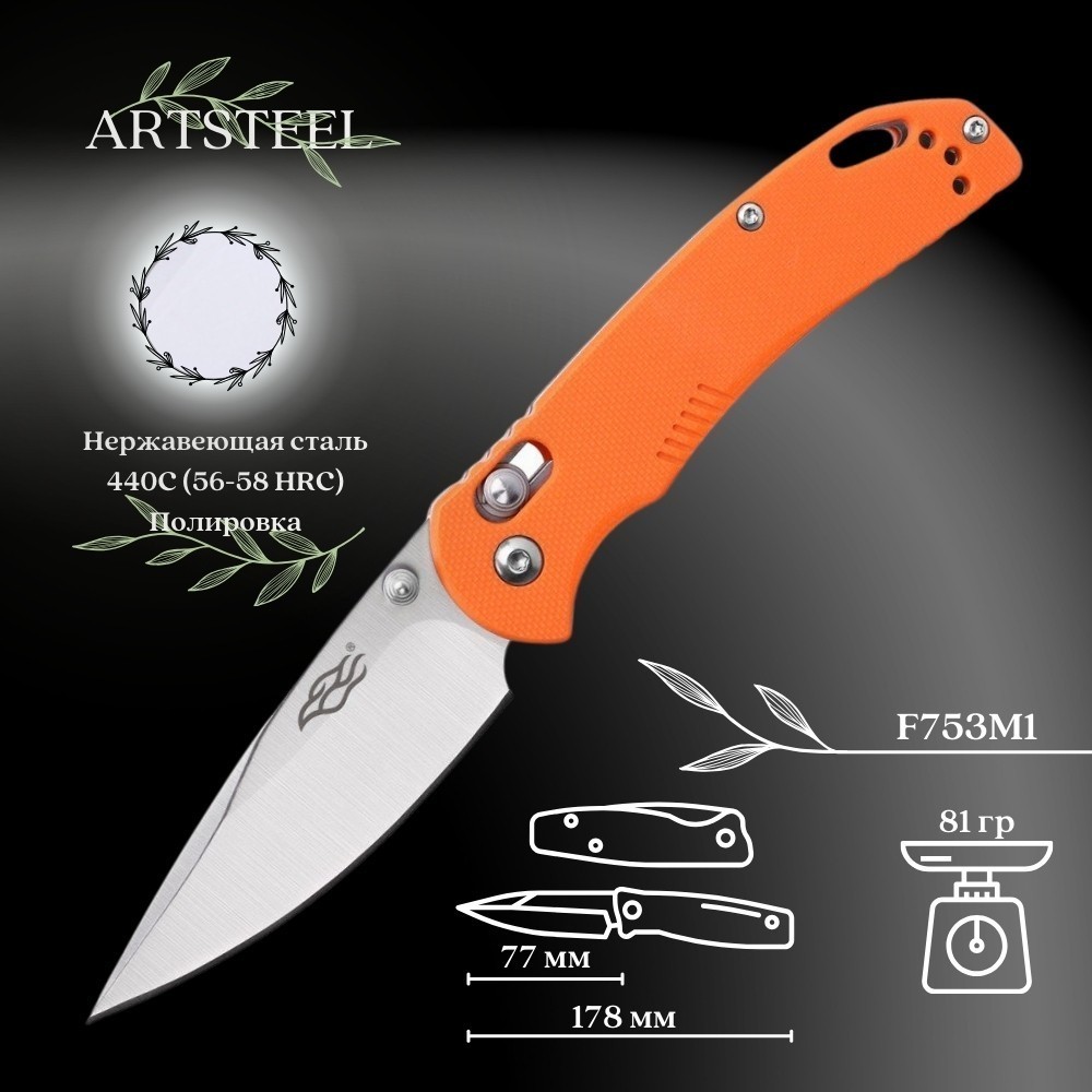В открытом положении, размер модели Firebird F753M1 равен 17.8 см. Рукоятка этого ножа выполнена с использованием композитного материала G10. Он получен путем соединения стекловолокна с эпоксидными смолами. Этот материал совсем легкий, но по прочности практически не уступает стальной основе рукоятки. Мелкая текстурная накатка на стеклопластике помогает крепко держать нож в руках. Кроме того, нож можно дополнительно пристраховать при помощи темляка, который, при желании, вдевается в отверстие на ручке Firebird F753M1. Клипса же, используемая для ношения на ремне, изготовлена из стали.
