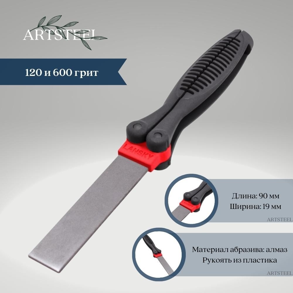 Двусторонняя точилка-бабочка, материал абразива - алмаз с гриностью 120, 600. Алмазный абразив является одним из самых твердых материалов на Земле. Он используется для высокоточной заточки и полировки из-за своей невероятной твердости и износостойкости. Зернистость 120 считается грубой и используется для начальной заточки ножей с тупыми лезвиями или поврежденными кромками. Эти зерна быстро удаляют металл и восстанавливают форму режущей кромки. Зернистость 600 используется для средней заточки. Она помогает создать более гладкую и остро заточенную кромку после грубой заточки.