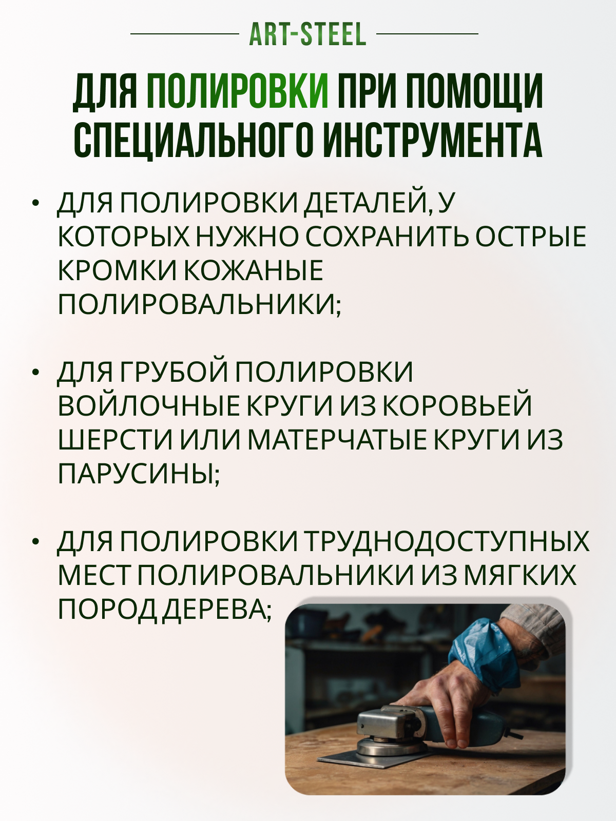 Процедуру зачистки и полировки можно выполнять вручную, используя чистый и мягкий кусок ткани. Также возможна машинная обработка с применением специальной войлочной насадки, надетой на дрель или шлифовальную машинку.