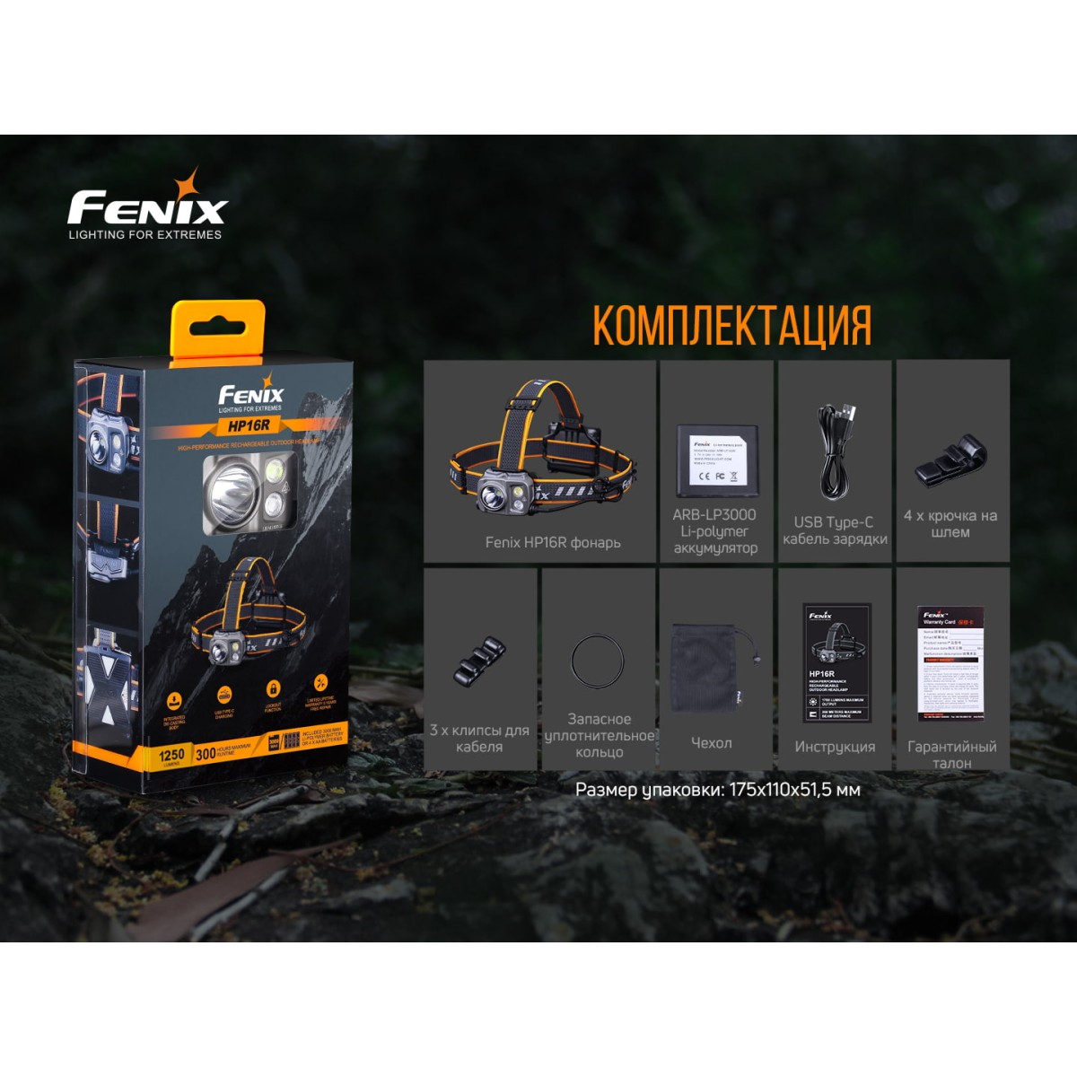 Модель фонаря Fenix HP16R, аккумулятор ARB-LP3000 Li-polymer, кабель для зарядки USB Type-C, четыре крючка для крепления на шлем, три клипсы для кабеля, запасное уплотнительное кольцо, сумка для хранения, инструкция пользователя, талон гарантии.