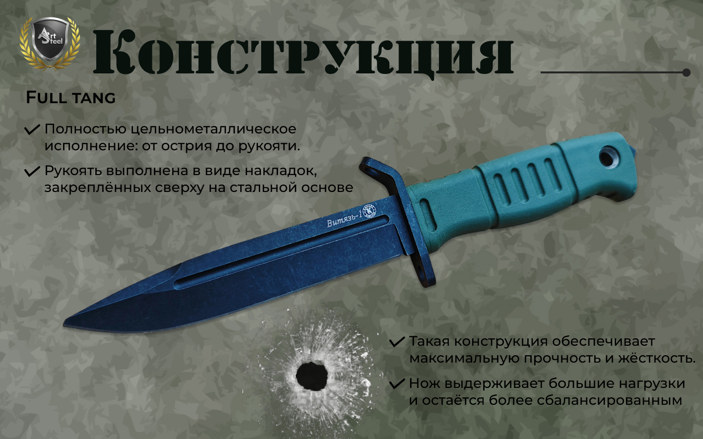 Функциональные элементы продуманы для практического использования: гарда защищает руку, отверстие под темляк обеспечивает дополнительные варианты ношения, а стеклобой пригодится в экстренных ситуациях. Дополнительный долл на клинке облегчает вес клинка. Нож поставляется в ударопрочном чехле из пластика с надёжным креплением на пояс. Его безопасно и удобно носить в поход или на охоту. Витязь-1 отлично подходит как охотничий нож, так и для тактического, армейского применения и самообороны. Не относится к холодному оружию.
