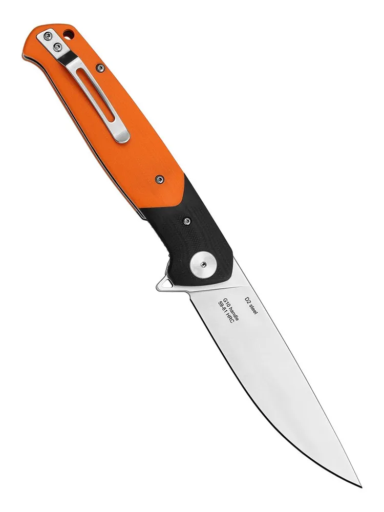 Клинок изготовлен из стали D2 — твёрдой и износостойкой, которая долго держит остроту даже при активном использовании. Такой нож уверенно справляется с нарезкой продуктов, подготовкой снаряжения в походе или мелким ремонтом.