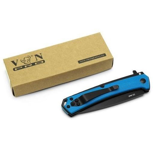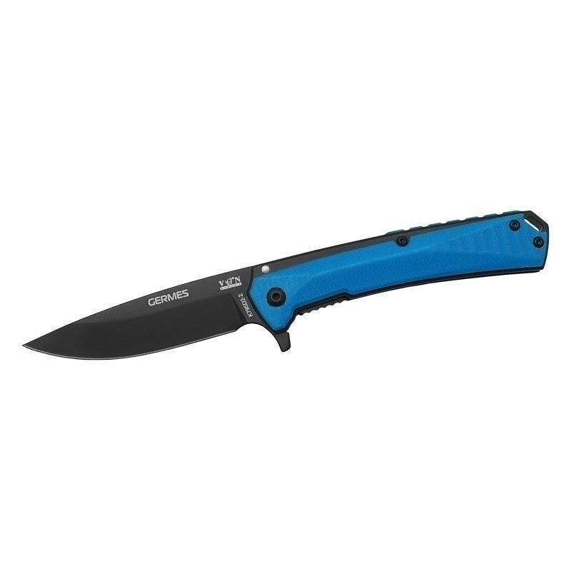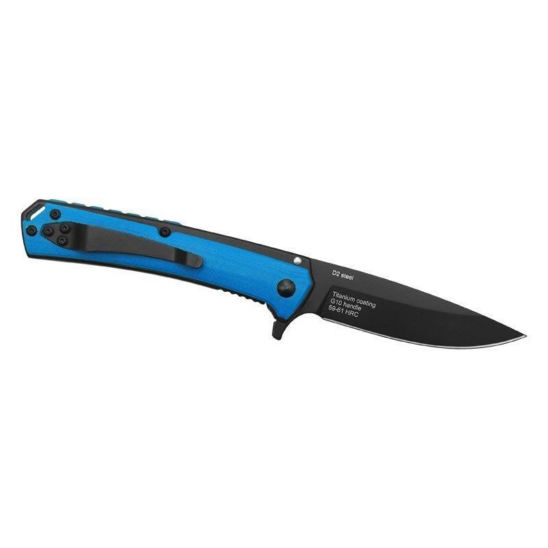 В качестве материала для изготовления клинка использована американская нержавеющая сталь D2. Она неплохо держит заточку, легко правится и требует минимум ухода. У клинка классический профиль Drop-Point с прямыми высокими спусками и сведением в 0,5 мм. Открывается нож при помощи флиппера, который служит мощным упором, когда нож разложен. Рукоять собрана на облегченных стальных лайнерах, по бокам рукояти накладки из ярко-синего G10. Текстура накладок предотвращает скольжение ножа в руке, агрессивный спейсер даёт более надёжное удержание.