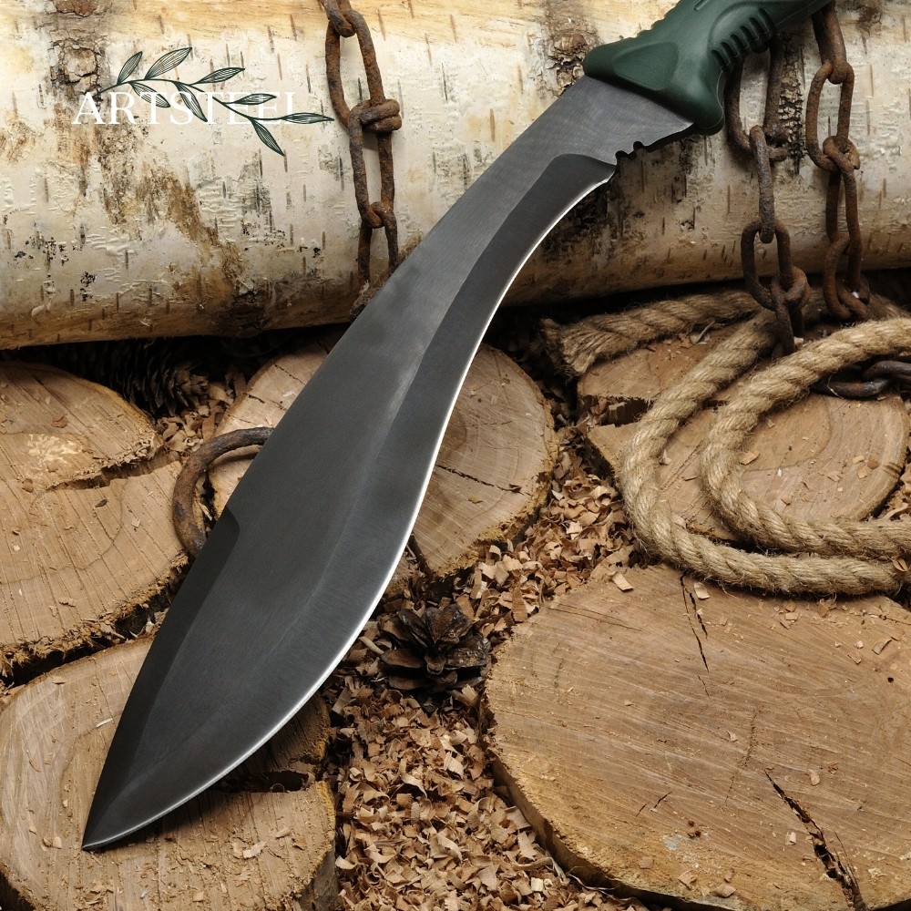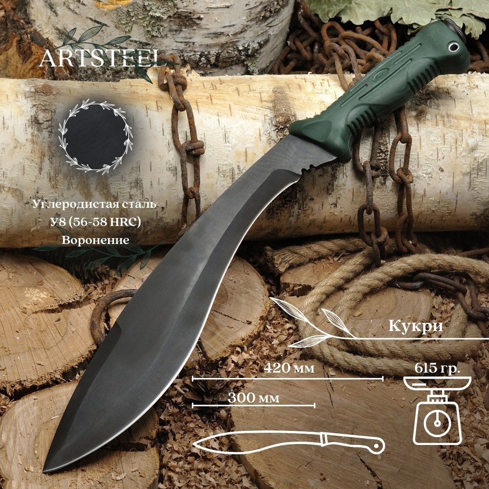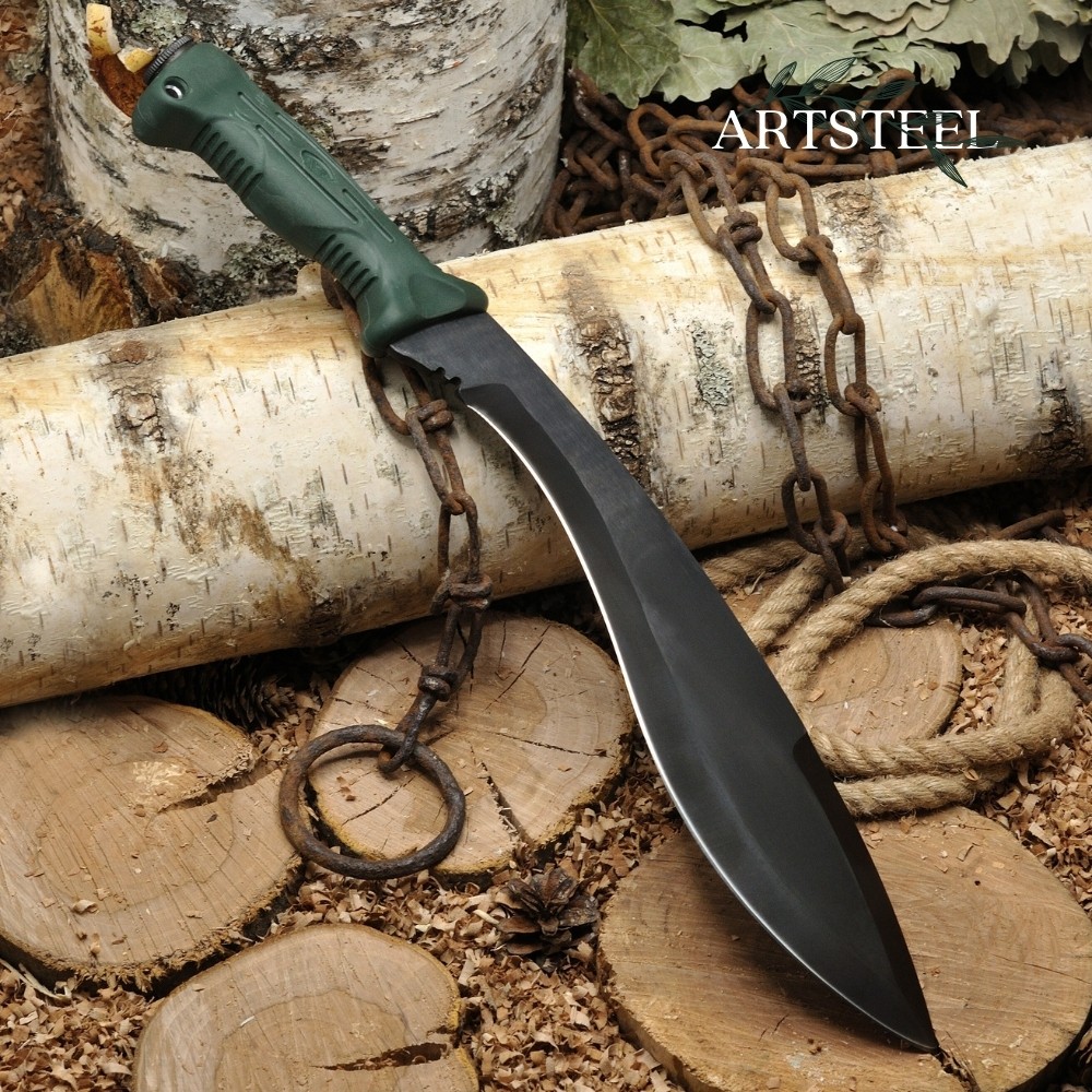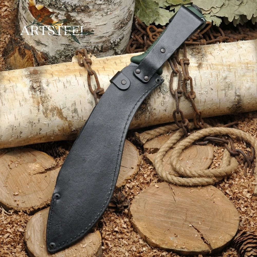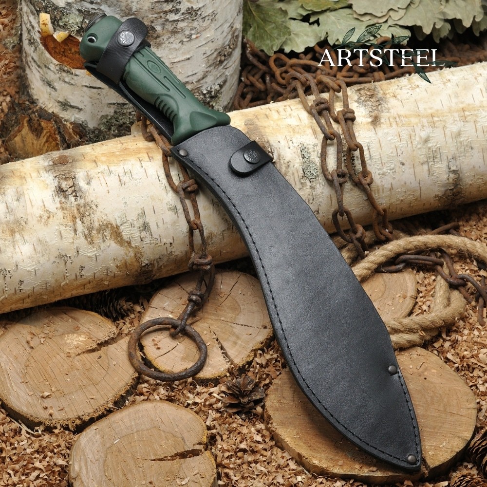 Изогнутое лезвие с расширением в конце исторически связано с традициями непальских гуркхов. Такая форма обеспечивает мощные рубящие удары. Заточка – прямая, длина лезвия – 300 мм.Мачете поставляется с ножнами из натуральной кожи, которые защищают клинок и делают хранение безопасным.