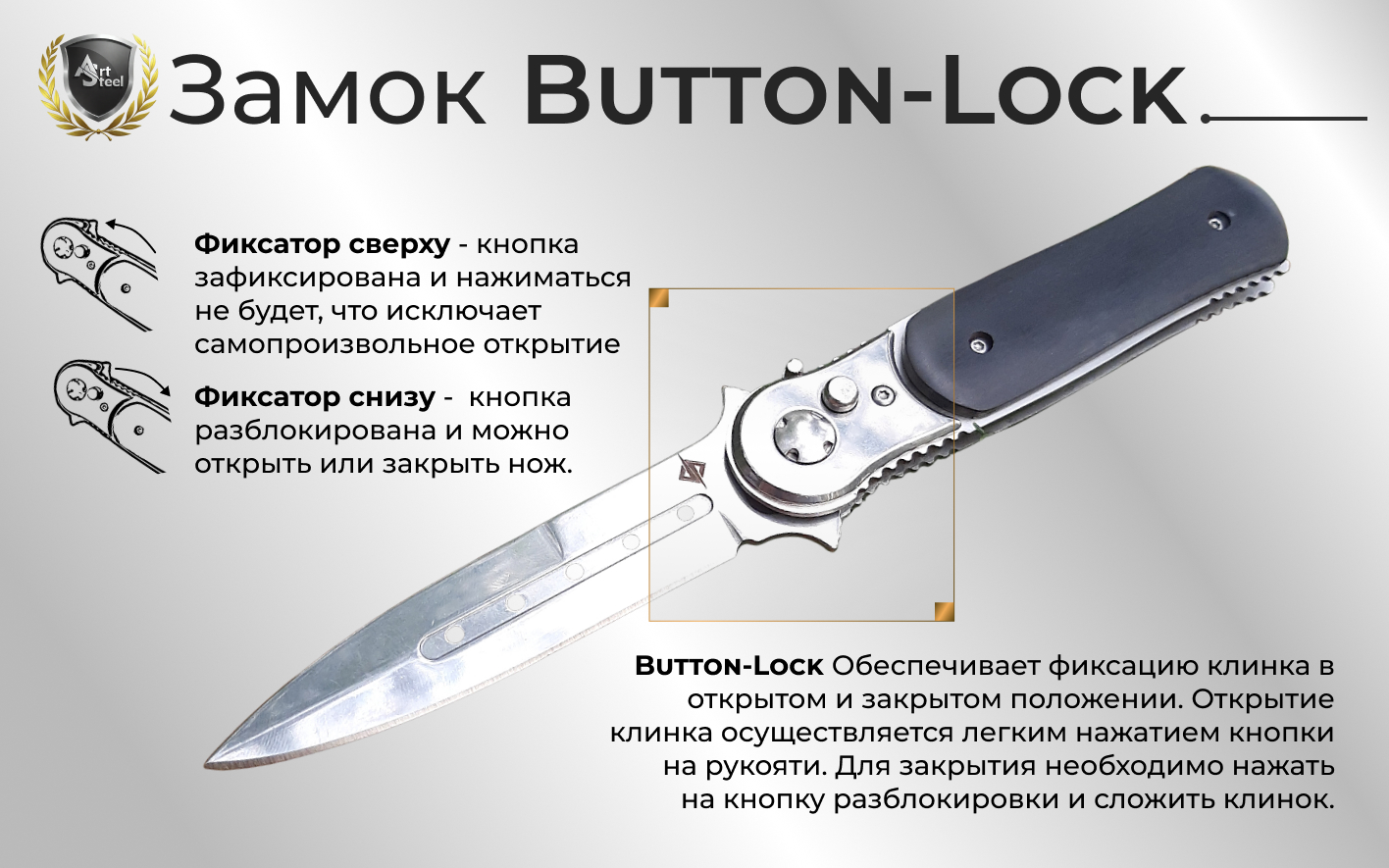 Нож оснащён надёжным замком Button Lock, который позволяет легко и безопасно открывать и закрывать клинок одной рукой.