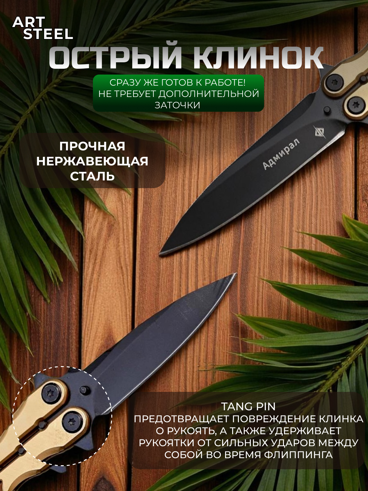 Балисонг подходит для профессионального флиппинга, так как режущая кромка имеет острую заточку. Нож Адмирал станет отличным подарком для детей, друзей, коллег и всех любителей трюкового флиппинга. Нож не относится к холодному оружию, разрешено свободное ношение и хранение, что делает его безопасным и законным для повседневного использования.Условия оплаты