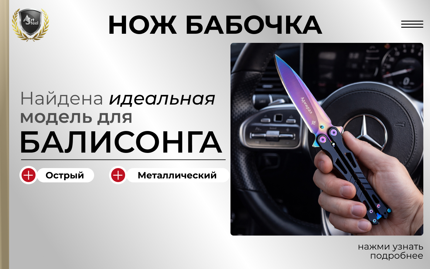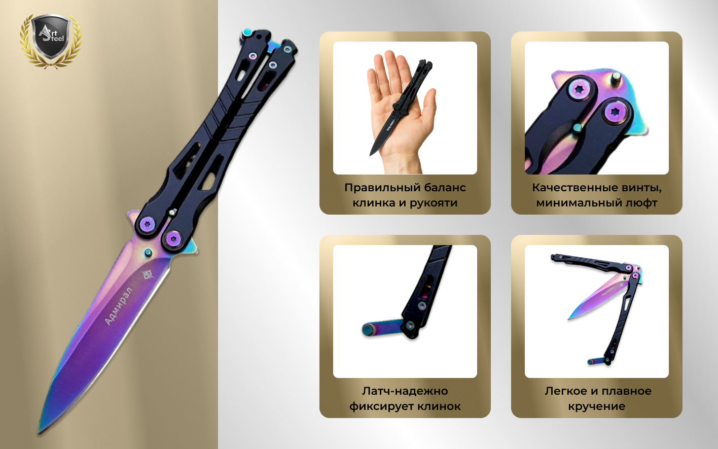 Нож бабочка тренировочный металлический — полностью изготовлен из нержавеющей стали марки 420: широкий клинок с высокими спусками сделан из прочной стали с высоким уровнем сопротивления коррозии, цельнометаллическая рукоять отличается прочностью и одновременно достаточно легкая, не добавляет ножу лишний вес. У основания клинка имеются выступы, которые в раскрытом виде образуют небольшую двустороннюю гарду. Несмотря на современный вид, «Адмирал» в сути своей остается балисонгом, который прост, надежен и всегда готов к работе. Туристический нож-бабочка производится в нескольких исполнениях, которые различаются цветом защитного покрытия и обработкой клинка.