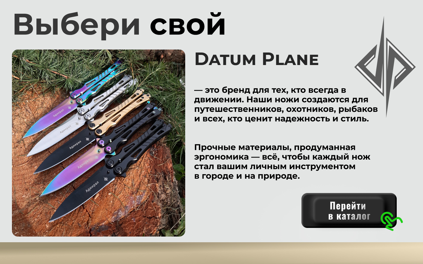Ножи-бабочки бренда «Datum Plane» привлекают внимание своим уникальным дизайном и функциональностью и являются оптимальным выбором для тех, кто ищет сочетание стиля и высокого качества по демократичным ценам. Одна из востребованных моделей в нашем магазине — нож-бабочка «Адмирал».
