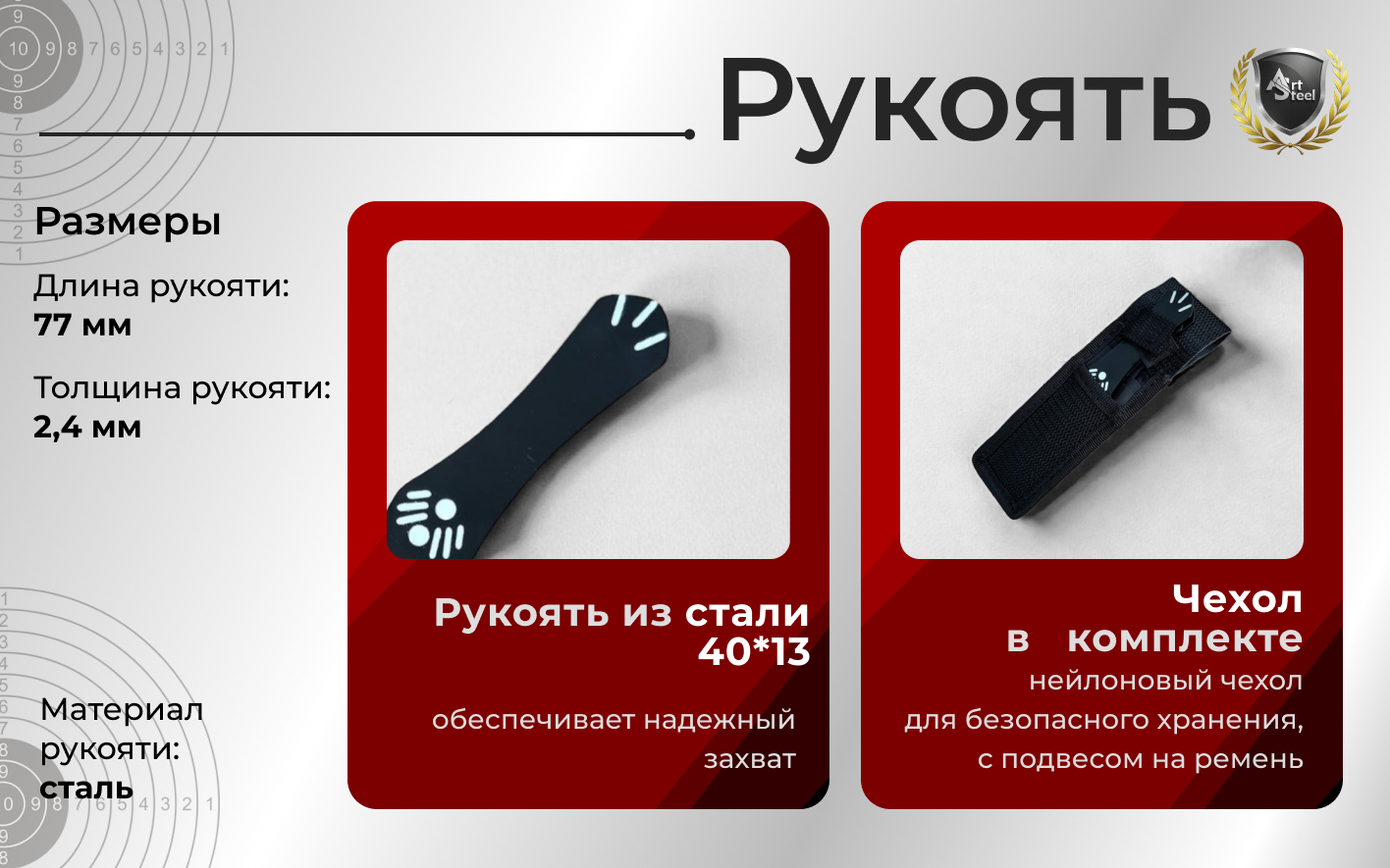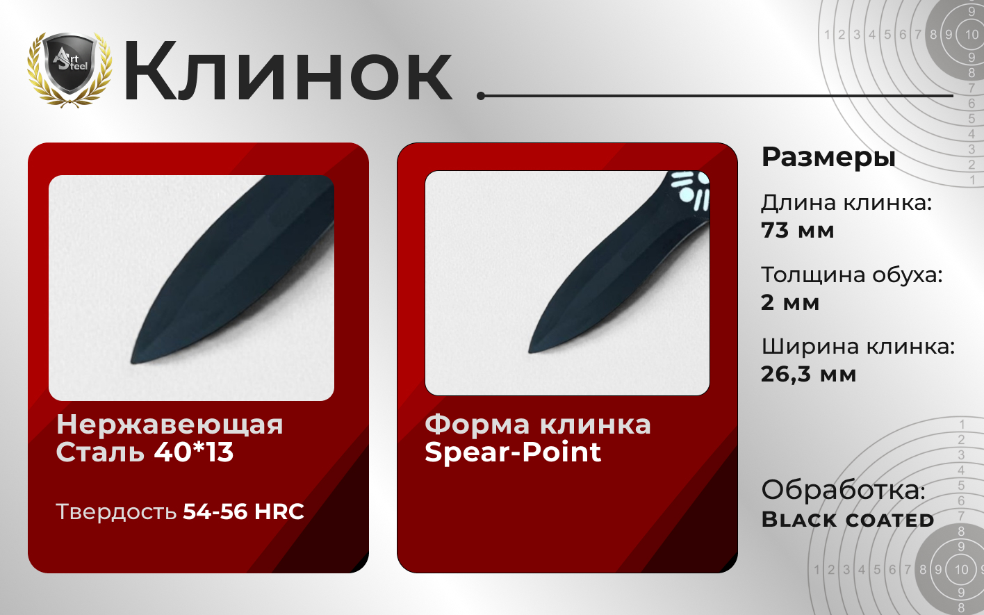 Набор метательных ножей состоит из трех идентичных ножей, что делает его удобным для тренировок и соревнований. Они имеют фиксированный клинок, что обеспечивает большую стабильность при броске, и удобную рукоять, которая обеспечивает надежный захват. Сталь 40х13, из которой выполнен клинок данного ножа, имеет отличные рабочие показатели: высокую износостойкость и жаропрочность, а также устойчивость к коррозии, что позволяет использовать данный нож в экстремальных условиях. Все ножи имеют одинаковый размер и вес, что обеспечивает равные усилия для всех попыток броска. Тренировочный нож в наборе позволяет начинающим метать ножи без риска для окружающих и самих себя. Он не имеет режущей кромки, что предотвращает возможность поранится во время броска. Такие ножи ещё называют кунаи - японские ножи для метания, которые имеют острый кончик. Иногда его еще называют нож перо. Независимо от этого, метательный нож - это легкий и компактный нож, который прекрасно подходит для бросков на дальние расстояния. Он имеет простую форму и позволяет быстро и точно навести на цель.