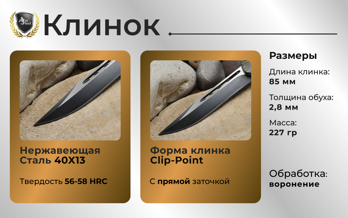 Перочинный складной нож имеет компактные размеры и в сложенном виде занимает минимум места в кармане или рюкзаке. Клинок выполнен из легированной нержавеющей стали 40Х13 (аналог 440) с твердостью 56–58 HRC, что гарантирует высокую стойкость к коррозии, износоустойчивость и долгий срок службы. Рукоять изготовлена из прочного алюминиевого сплава, что обеспечивает надежность и удобство при эксплуатации даже в сложных условиях.Особенности конструкции