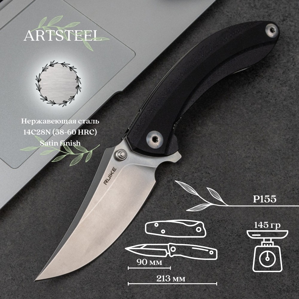 Округлые формы рукояти позволяют хорошо заполнить ладонь, а цепкие накладки из G10 предотвращают выскальзывание ножа при намокании. На данный момент, модель Ruike P155 доступна с накладками чёрного (P155-B) или песчаного (P155-W) цвета.