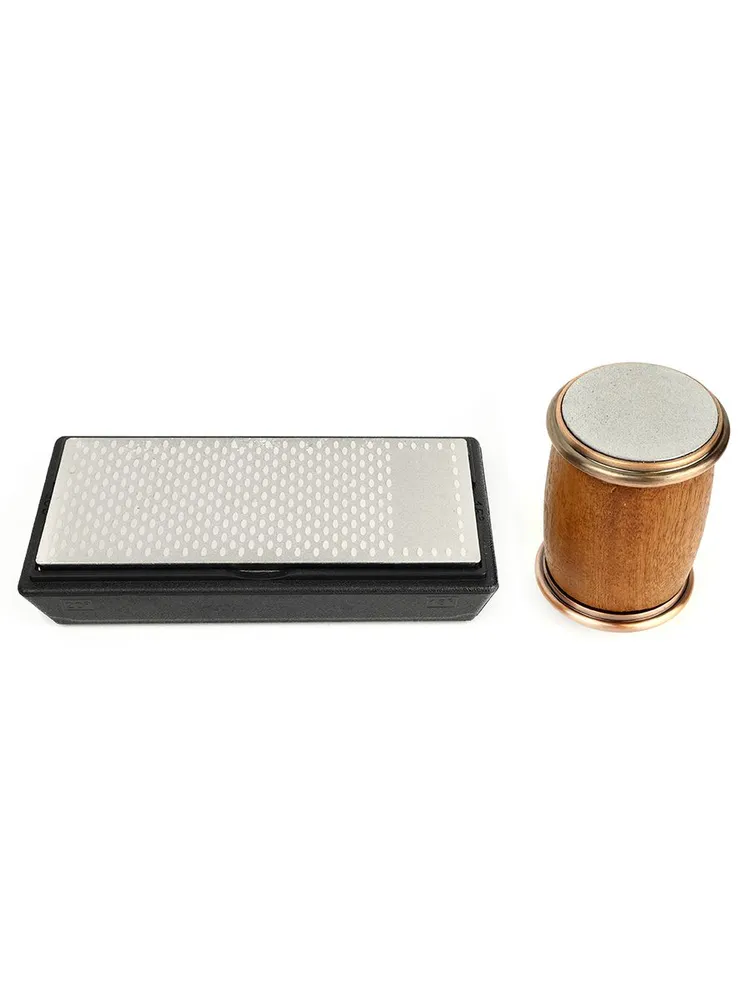 В состав набора входят абразивные элементы из алмаза и керамики, что позволяет выполнять два этапа заточки: восстановление повреждённого лезвия и тонкую доводку до идеально острого состояния. Алмазная поверхность быстро и эффективно снимает металл, а керамика придаёт кромке гладкость и чистоту реза.