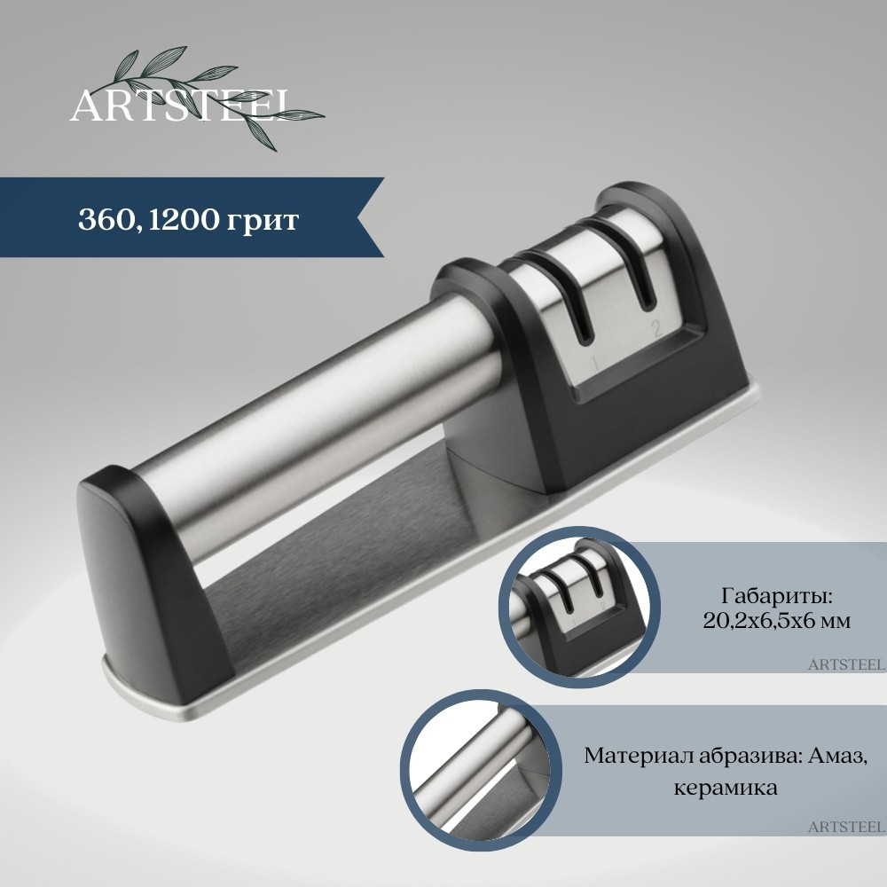 Выбор материала абразива зависит от степени затупления ножа. Алмаз с зернистостью 360 грит главным образом используется для предварительной заточки, в то время как керамика с высокой гритностью в 1200 отвечает за окончательную заточку, в которой лезвие точно сглаживается и доводится. Точилка позволяет точить стальные и керамические ножи.