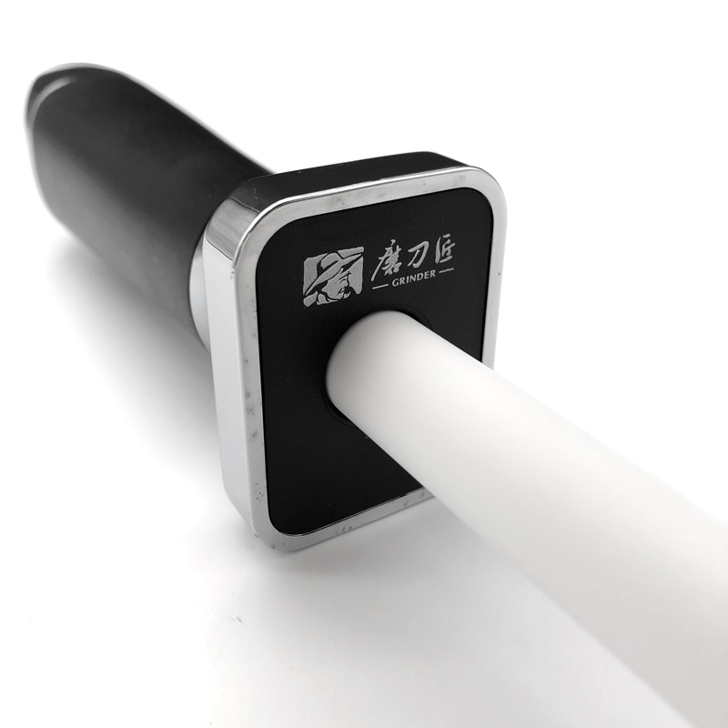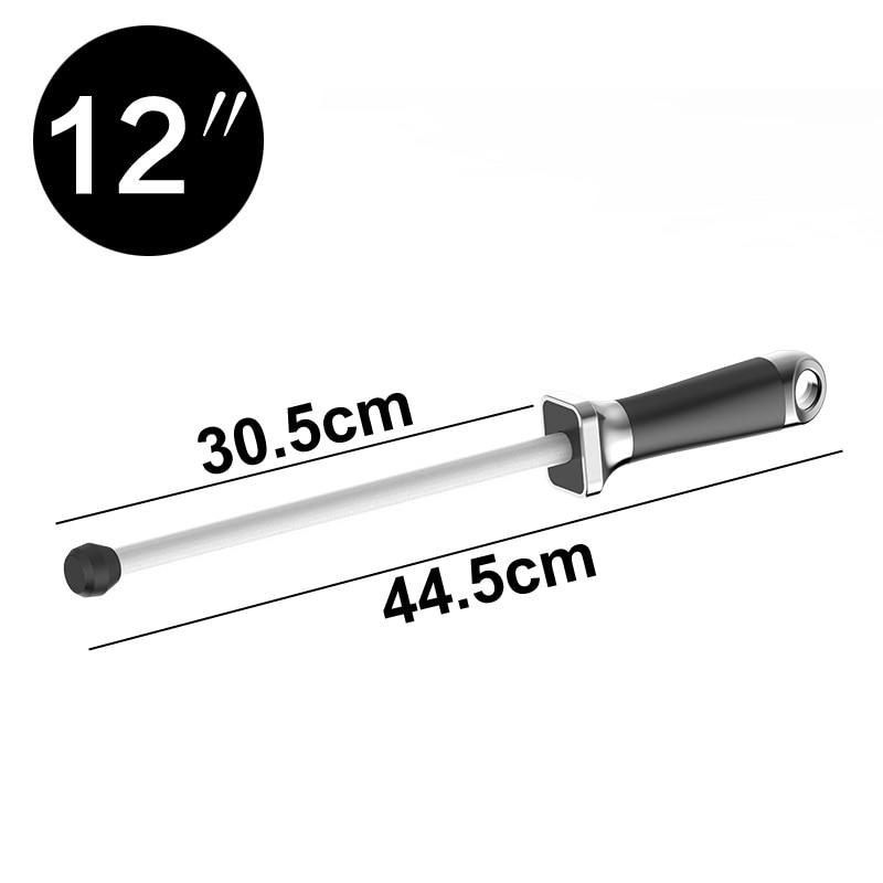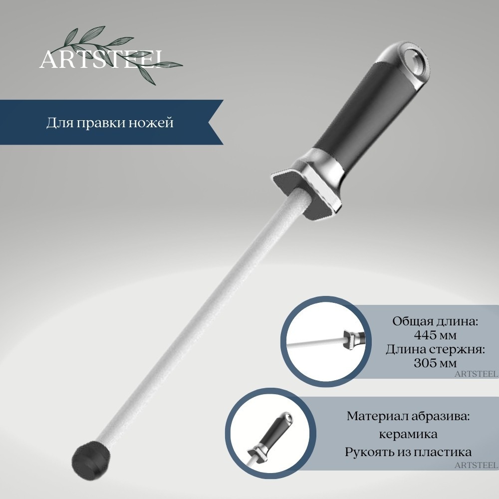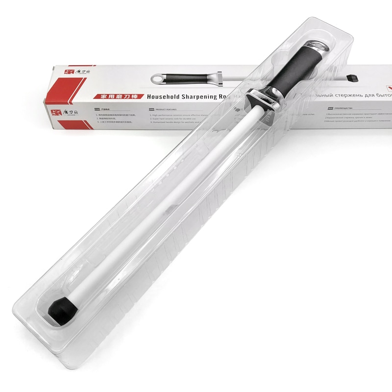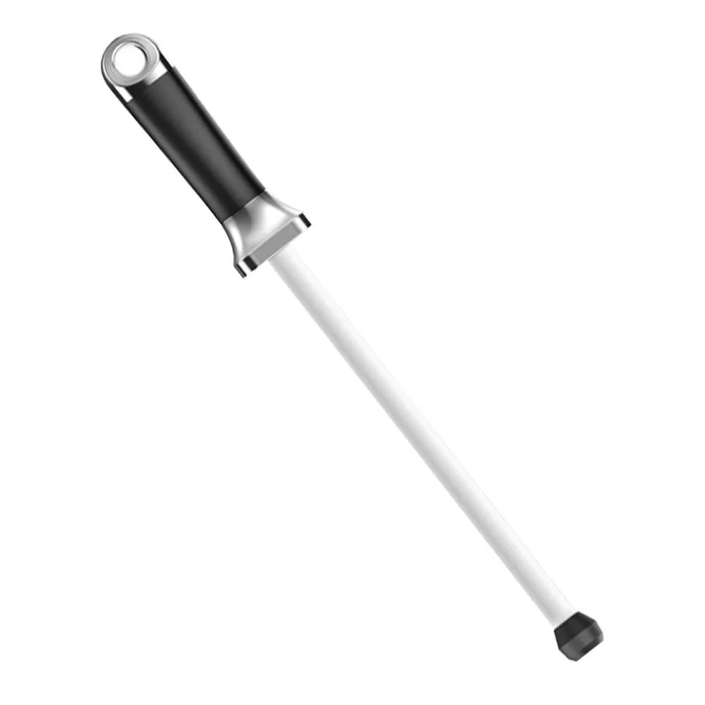 Керамический мусат для правки ножей с удобной рукоятью и резиновым упором. Рукоять имеет развитый металлический больстер для защиты руки во время заточки. Благодаря резиновому наконечнику мусат удобно упирать в стол, стену или любые другие массивные предметы для большей стабильности при работе.