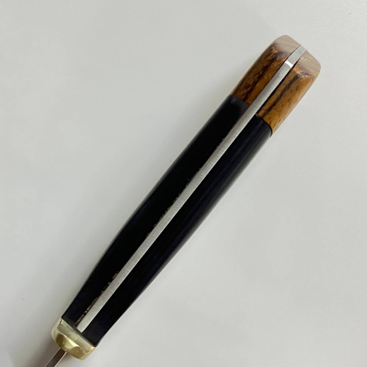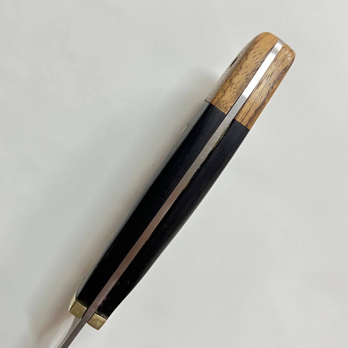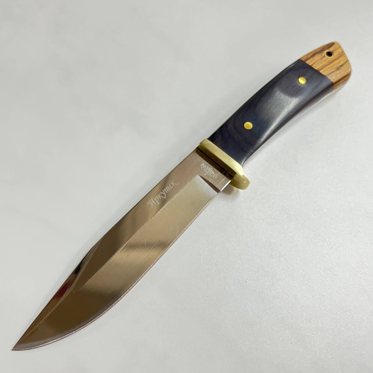 Походно-туристический нож. Длинный прямой клинок выполнен из качественной стали с высокой сопротивляемостью коррозии. Он легко точится, хорошо удерживает заточку. Рукоять деревянная, с плавным изгибом, который анатомически удобен и обеспечивает надежный хват ножа. Медный больстер выполняет роль односторонней гарды, защищая пальцы от соскальзывания на клинок. Иркутск снабжен удобными ножнами.