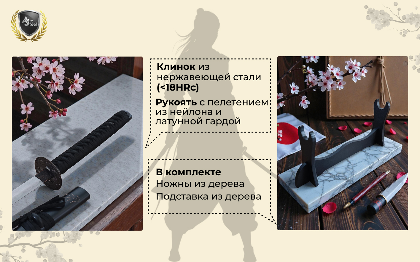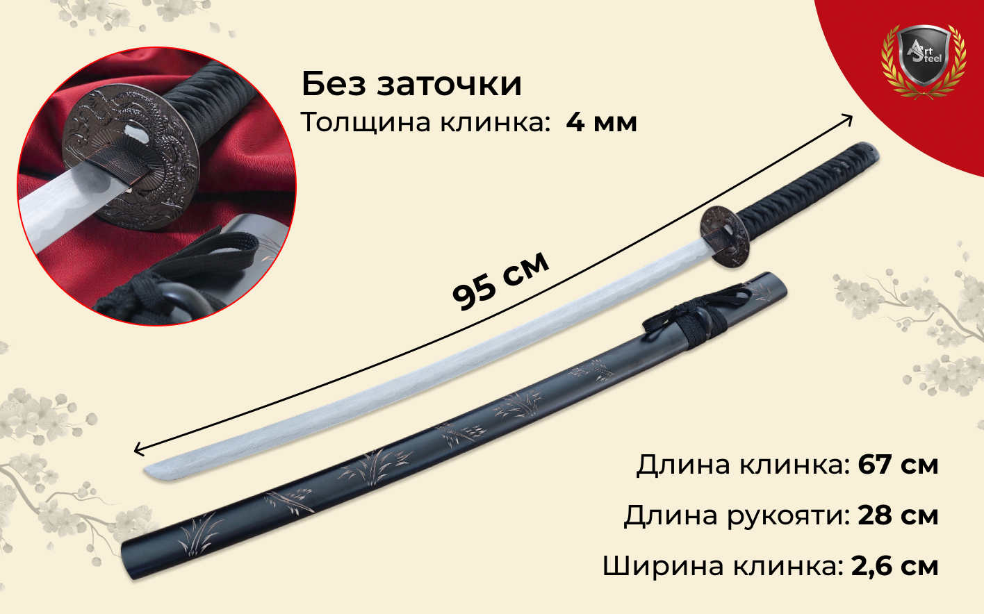 Данная катана металлическая — клинок изготовлен из высококачественной стали марки 420. Она является нержавеющей сталью, что позволяет клинку на протяжении долгого времени сохранять хороший внешний вид и свойства даже в условиях повышенной влажности. Катана является сувенирной продукцией, кромка клинка не заточена.